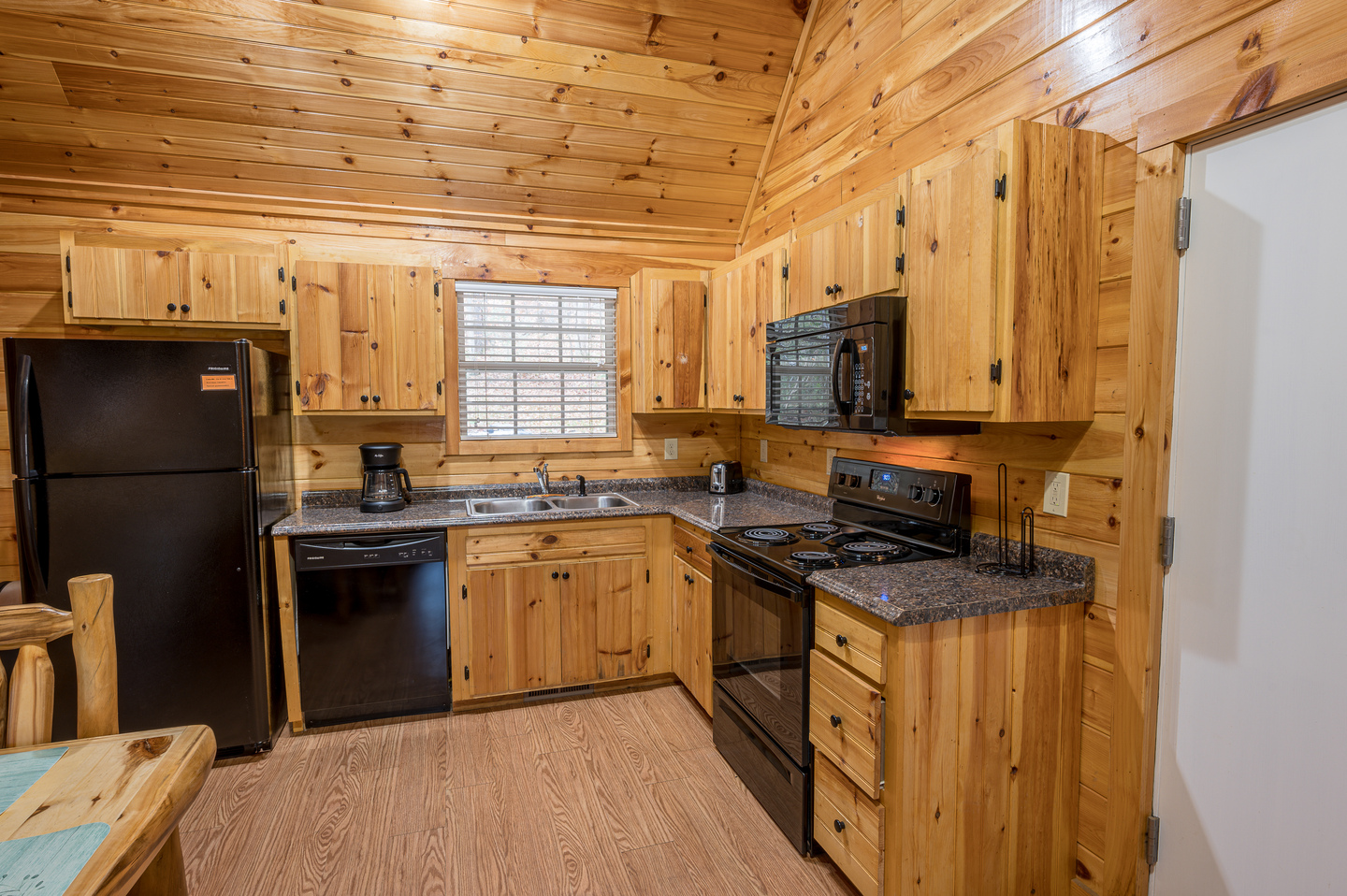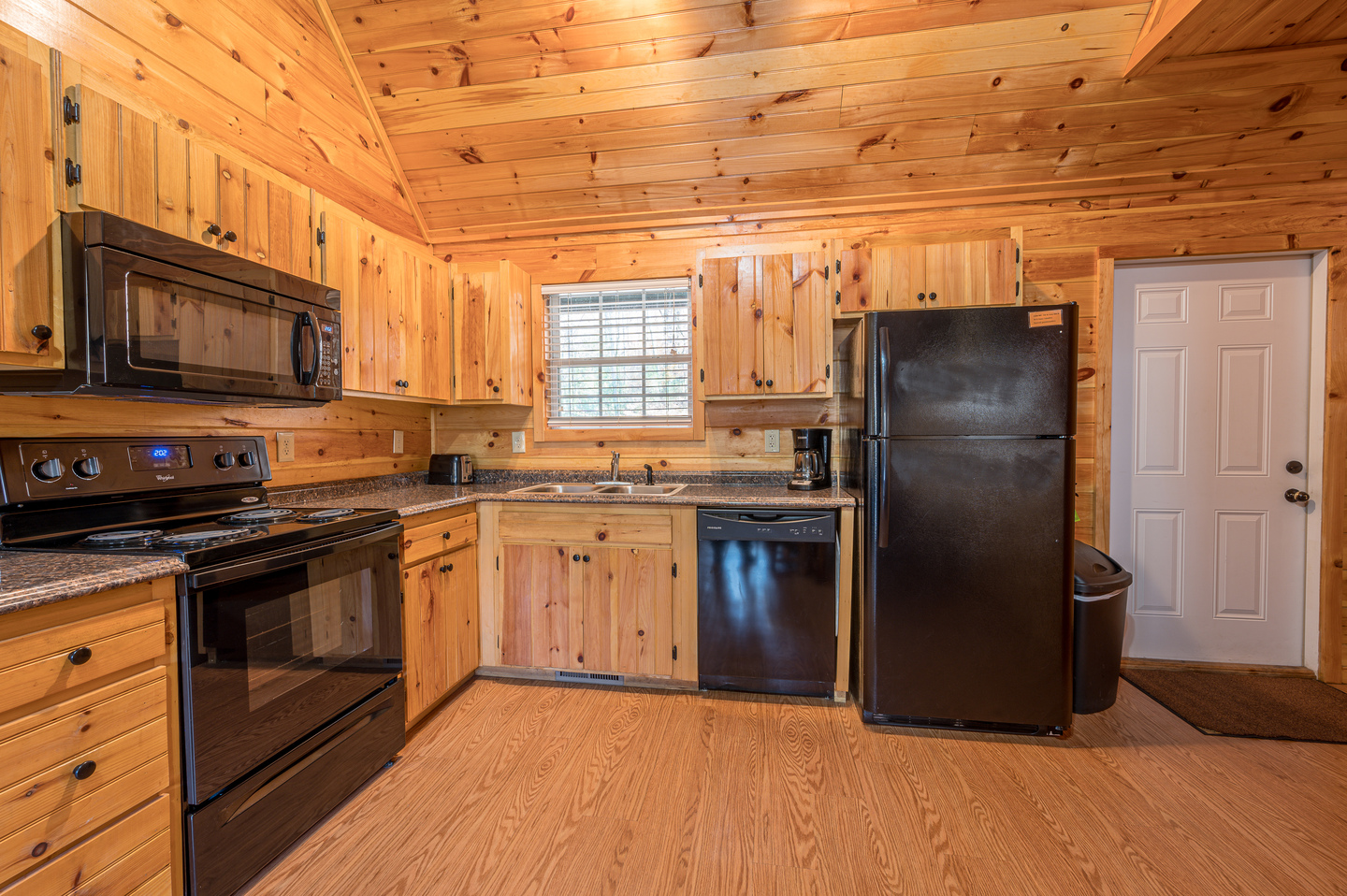 Each includes refrigerator, stove with oven, dishwasher, microwave, coffee pot, cookware, and dining utensils.