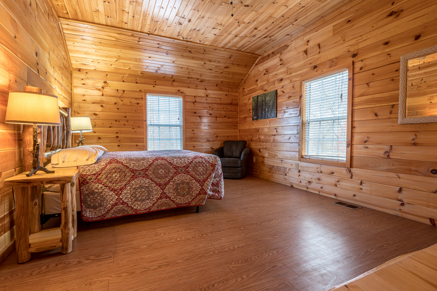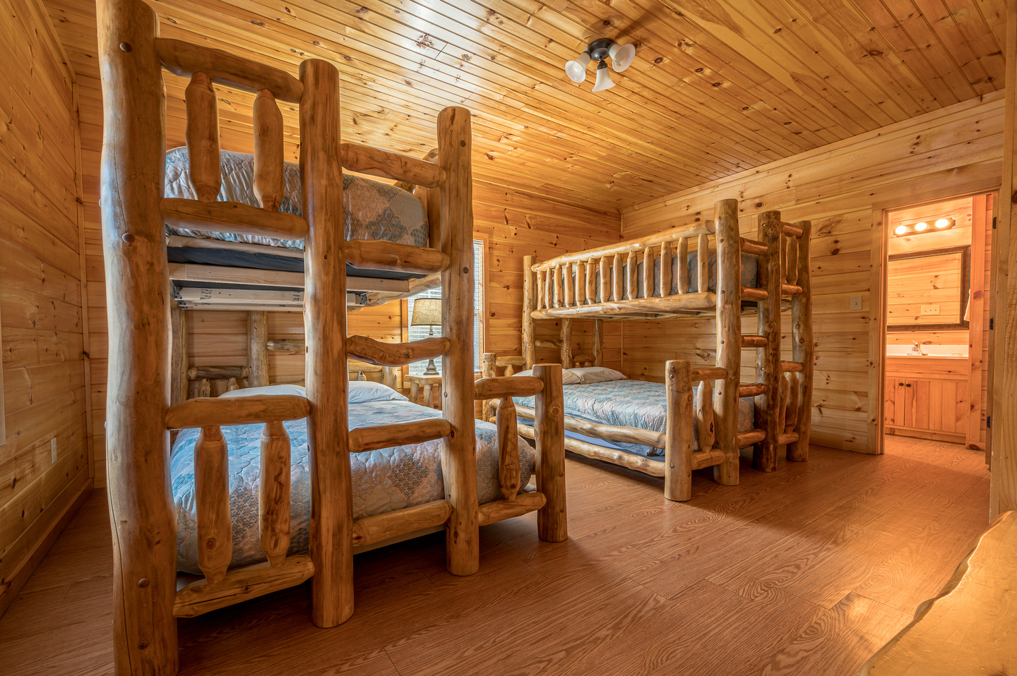 Downstairs – 4 queen beds with twin bunks on top, 2 bathrooms