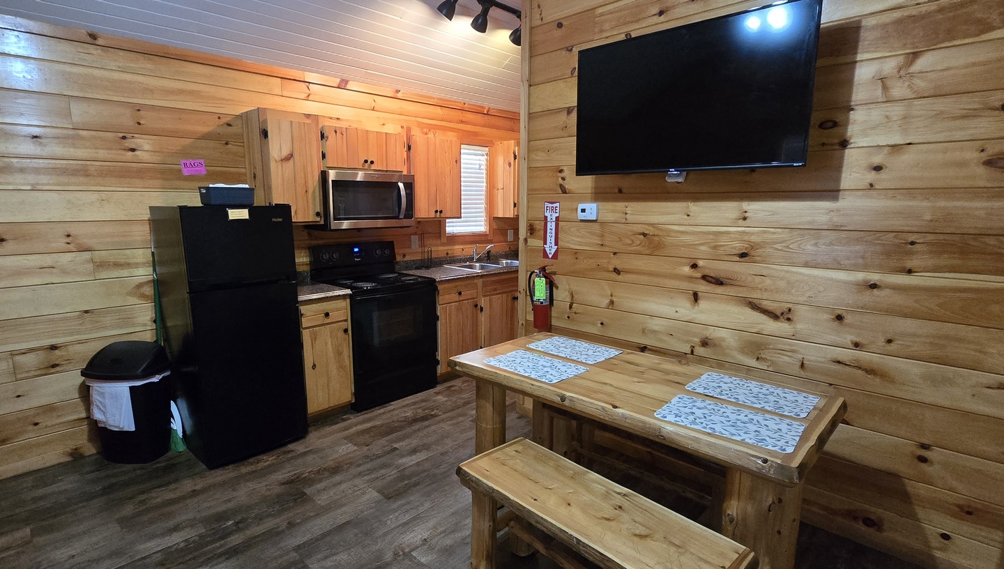 Includes refrigerator, stove with oven, dishwasher, microwave, coffee pot, cookware, and dining utensils.