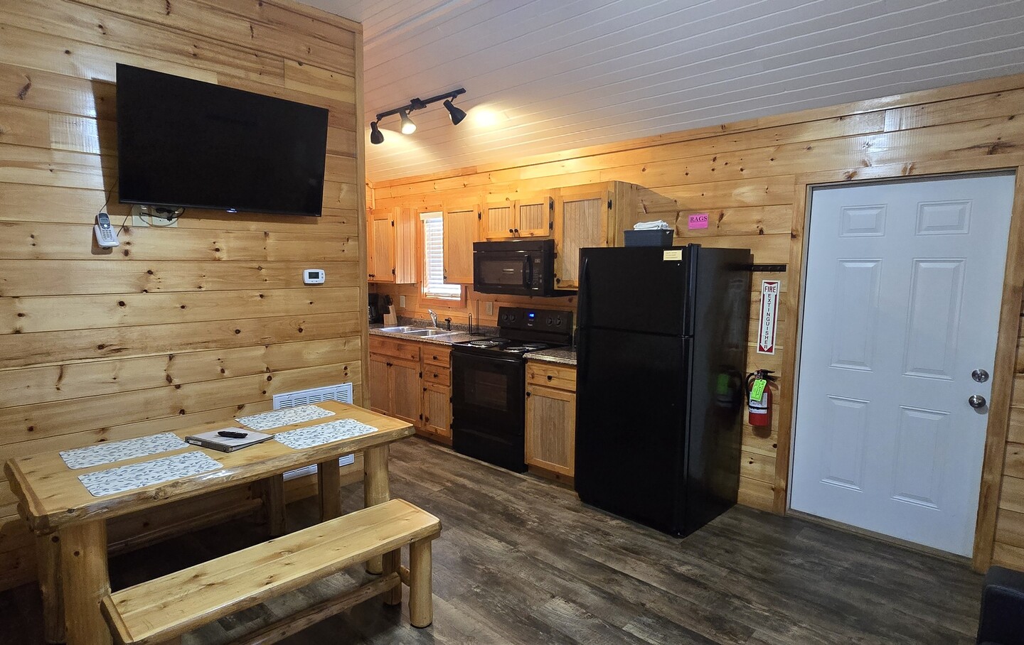 Includes refrigerator, stove with oven, dishwasher, microwave, coffee pot, cookware, and dining utensils.
