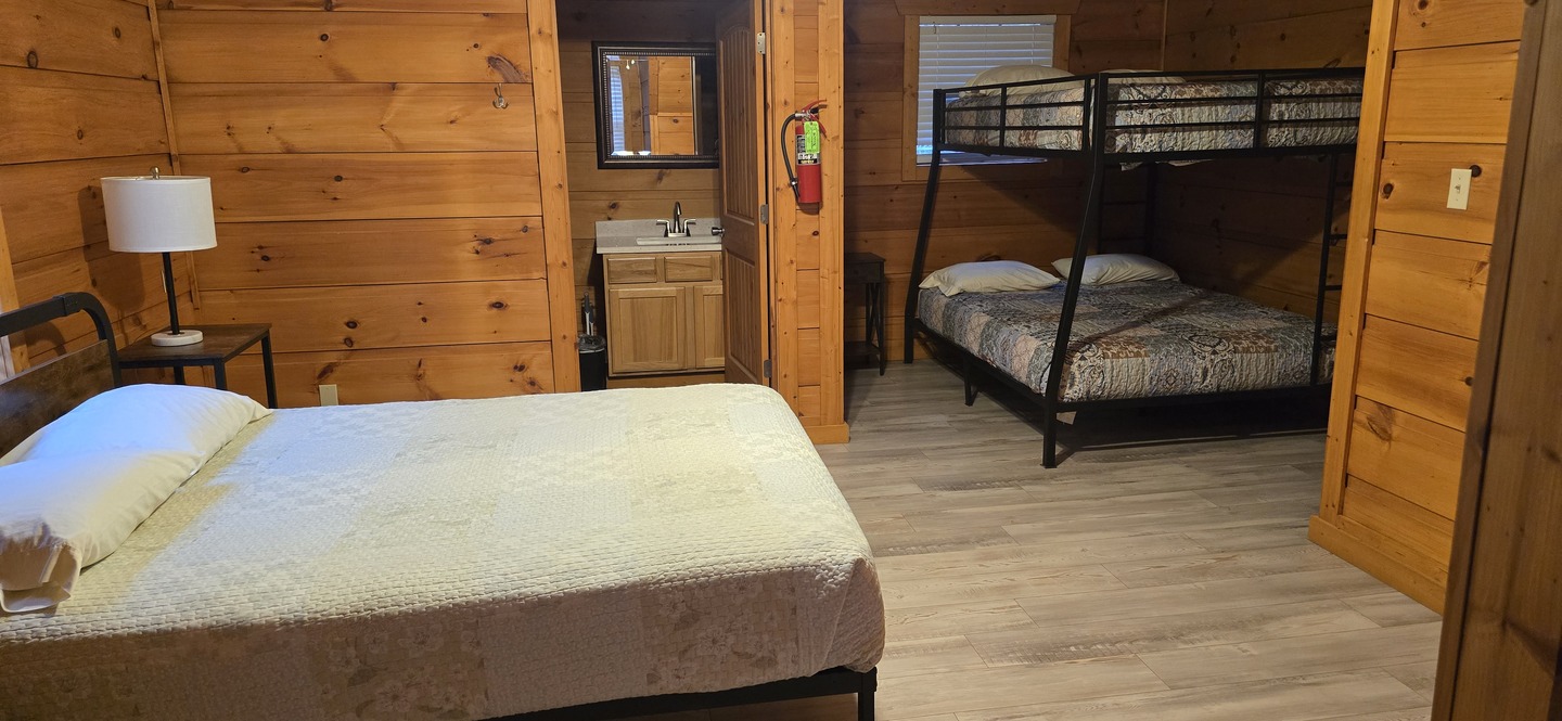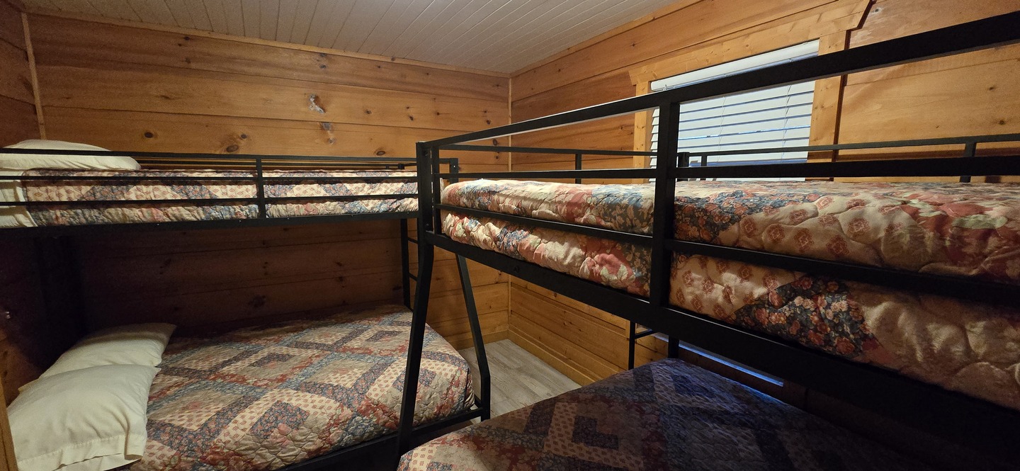 Main level - 1 queen bed with full XL top bunk, 1 full size bed with twin top bunk
