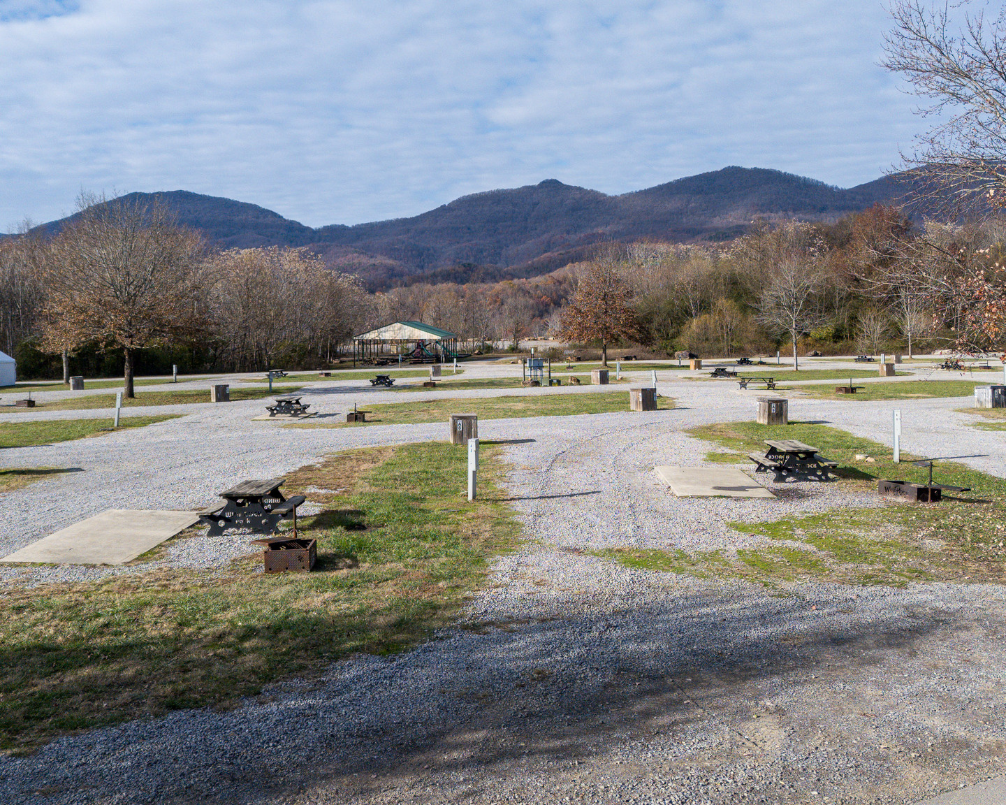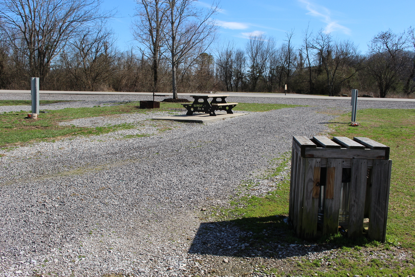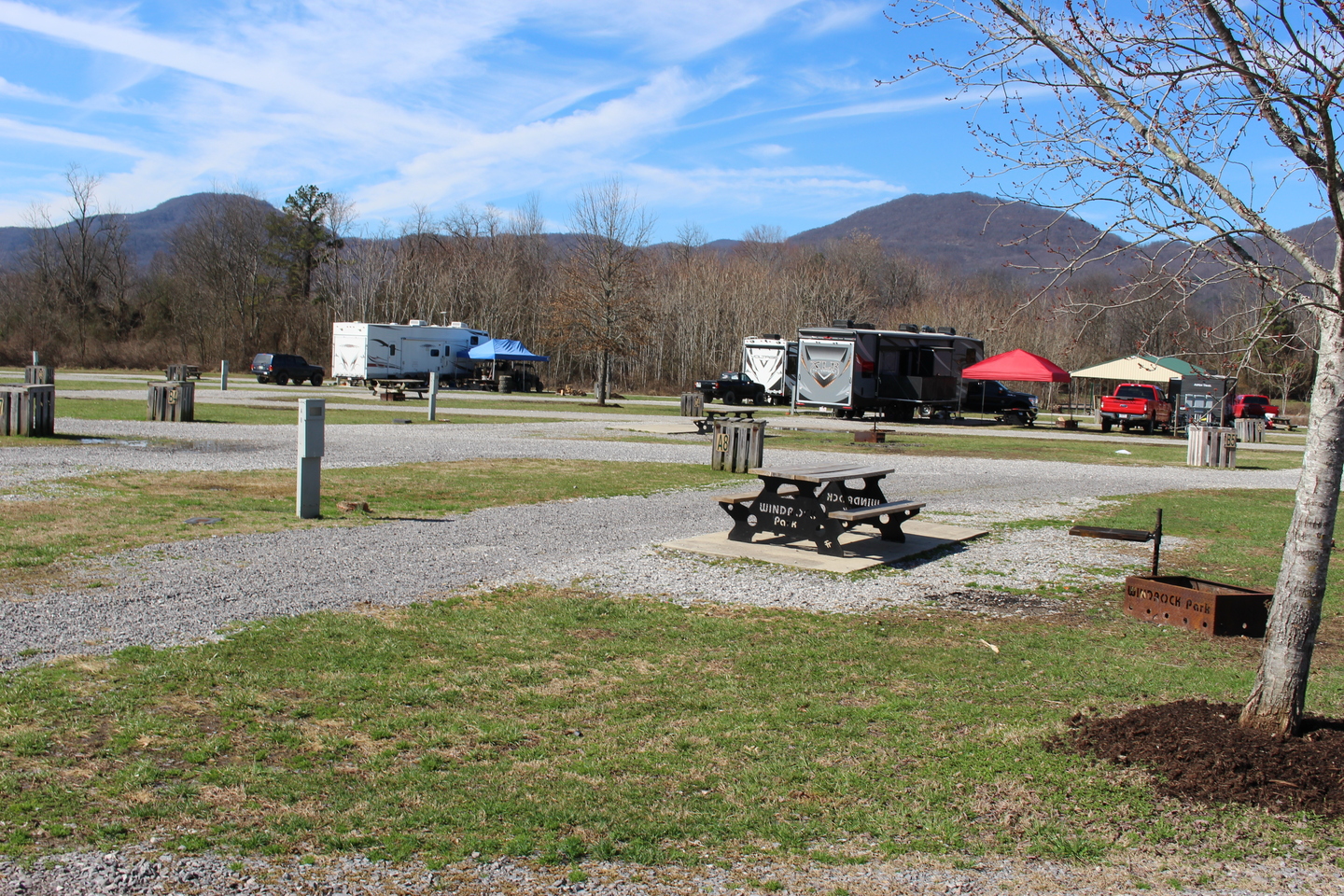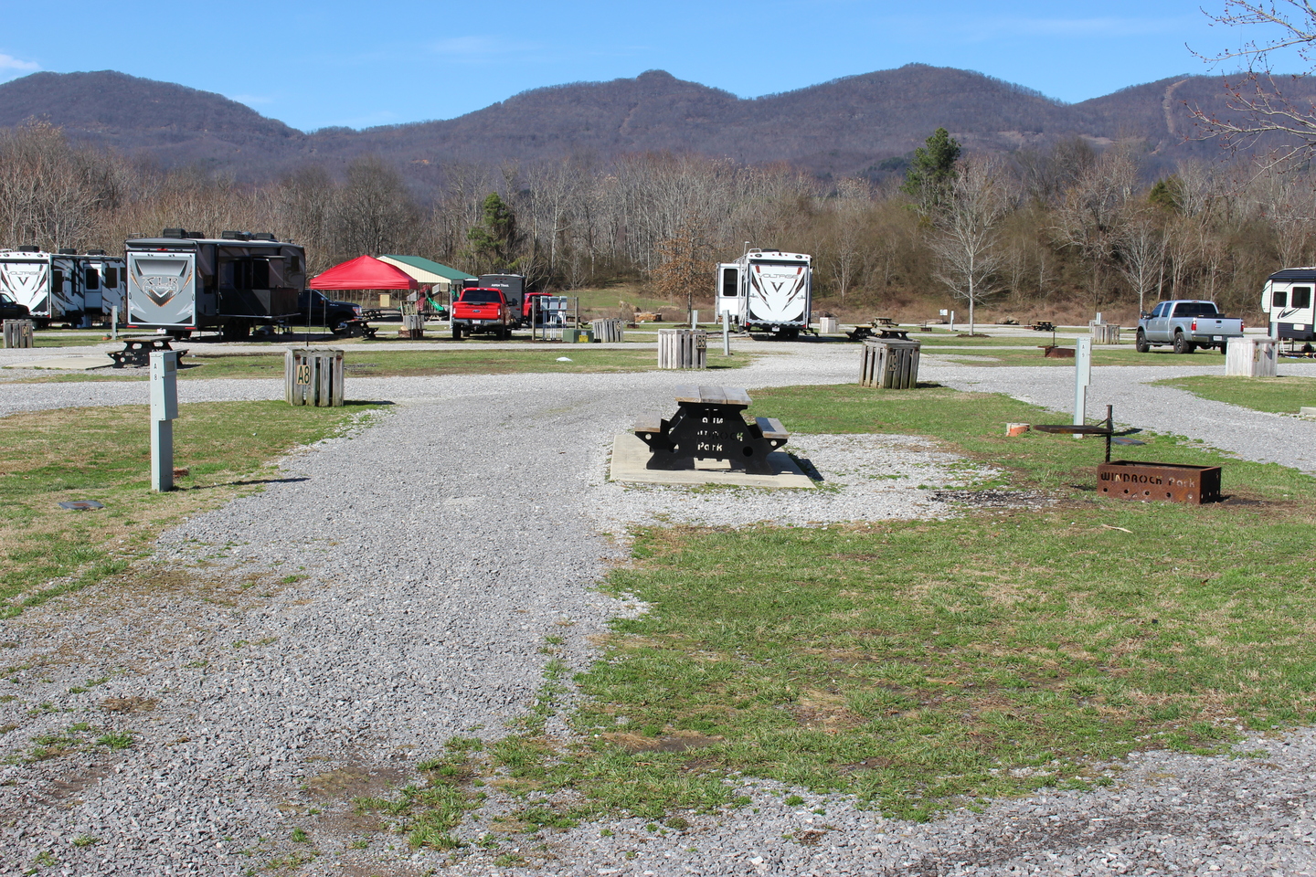 This RV site includes water, sewer connection, electricity (30, 50, 110 amps), concrete patio, picnic table, fire ring and access to a bath house.